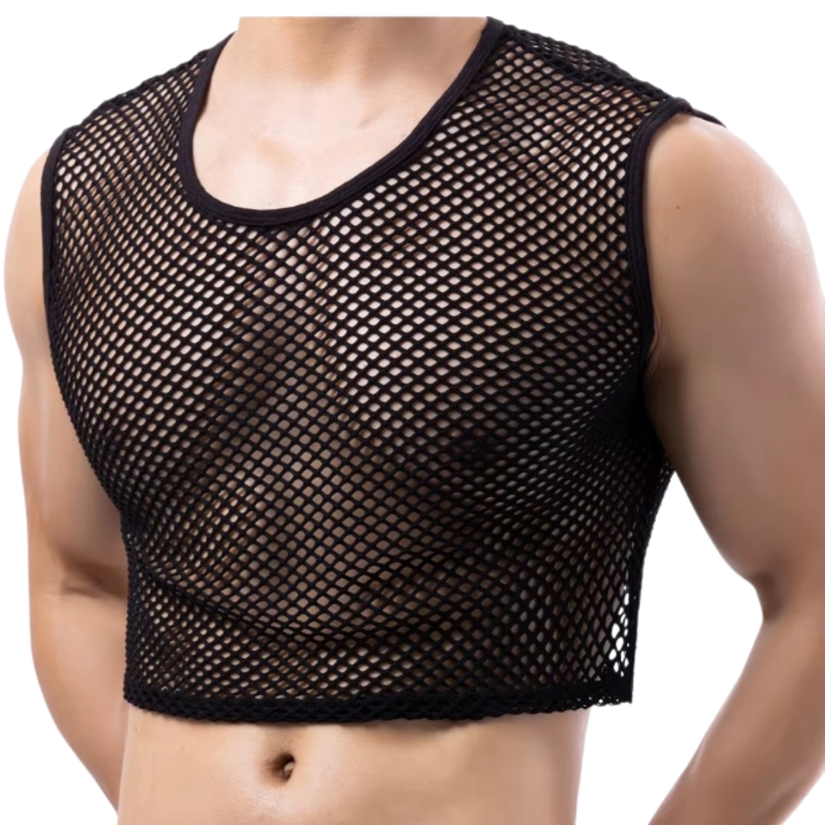 Cropped sem mangas em tecido arrastão preto, com média elasticidade e caimento ajustado. Modelo unissex, tamanho único (veste M/G masculino). Ideal para looks ousados e modernos.